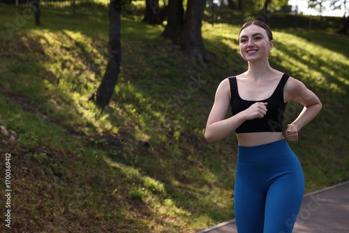 Smiling woman in sportswear running in park. Space for text