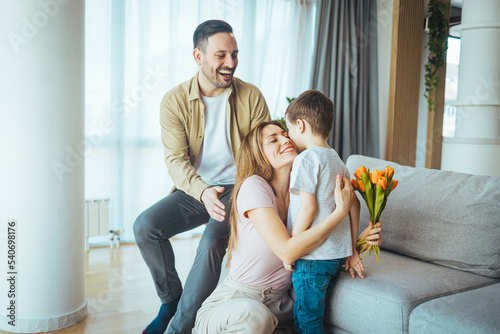 Smiling woman looking at adorable son while sitting on floor with mothers day card and flowers. Adorable kid boy congratulate mom with mother day or birthday embracing mum presenting greeting card
