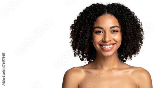 Smiling woman with dark curly hair, bare shoulders, and radiant skin, against a black background