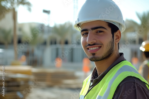 Smiling young engineer wearing helmet and safety glasses standing at building site