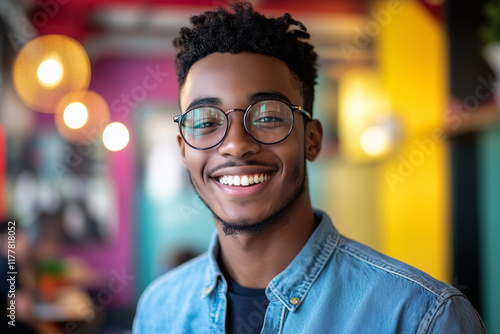 Smiling young entrepreneur showcases confidence in vibrant cafe setting during a casual day