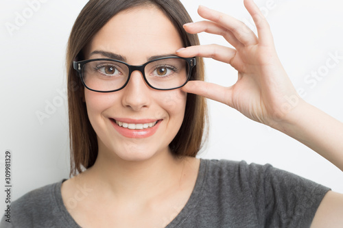 Smiling young woman in glasses on a white background.