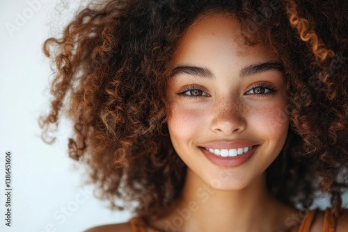 Smiling young woman with natural afro hairstyle in a light-colored top against a neutral background