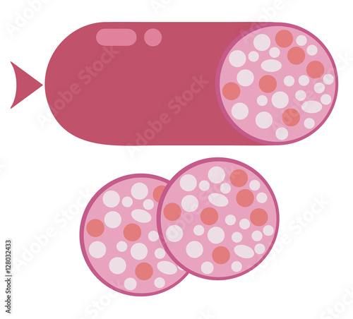 Smoked salami sausage isolated. Unhealthy eat, fat, smoked, fresh, bratwurst vector. Two slices of sausage
