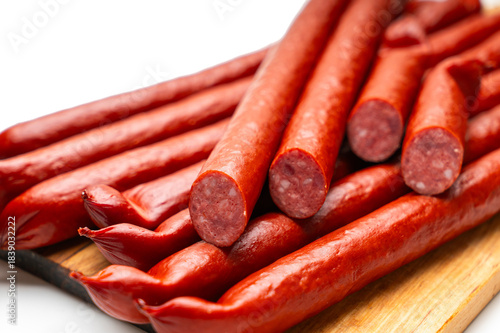 Smoked sausages close-up, food background