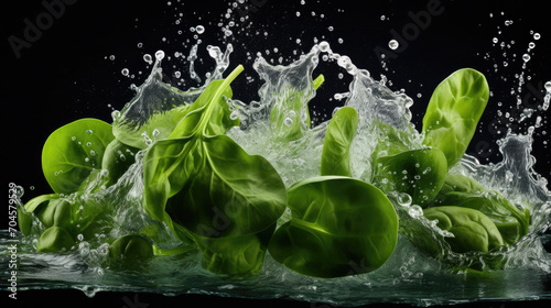 Smooth Fresh organic raw green Spinach leaf Vegetables falling into water and splashes