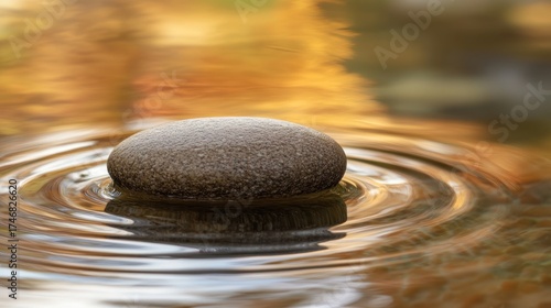 Smooth stone rests in still water, ripples radiate outward. Golden reflections