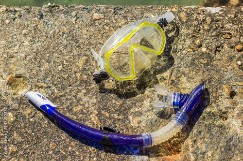 snorkeling plastic cheap equipment mask and tube on stone background, summer sea activities and hobby concept