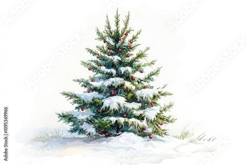 Snow Covered Christmas Tree With Red Ornaments