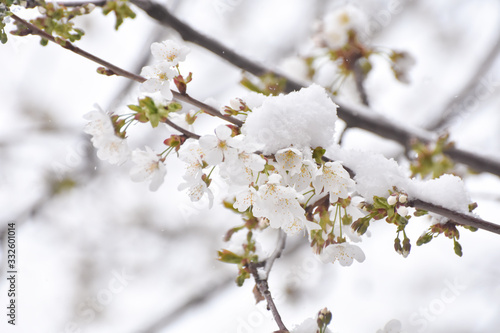 Snow on a first buds and white flowers on tree. Concept of bad weather condition, frost and agriculture disaster. Damage to the orchard