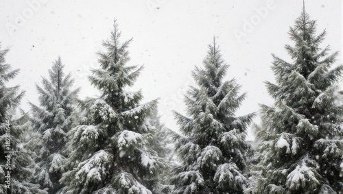 Snow-covered evergreen trees in a forest under a gray sky, with light snowfall