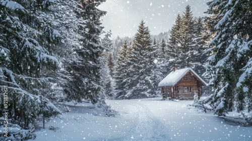 Snow-covered forest clearing with a small cabin and falling snow
