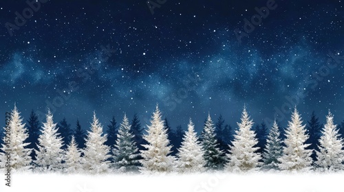Snow-covered trees in a dense forest under a clear, star-filled night sky.