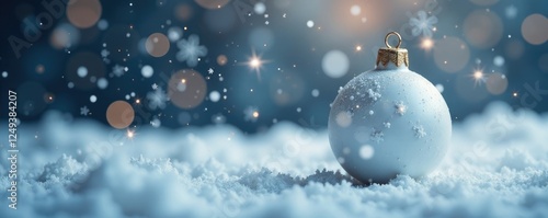 Snowflakes gently falling around a white Christmas ball, serene ambiance, merry winter