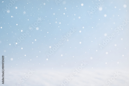 Snowflakes gently falling over a pale blue sky and white snow-covered ground, creating a peaceful winter backdrop..
