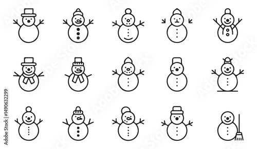 Snowman Icons Collection - Set of Minimalistic Line Art Snowmen with Scarves, Hats, and Buttons