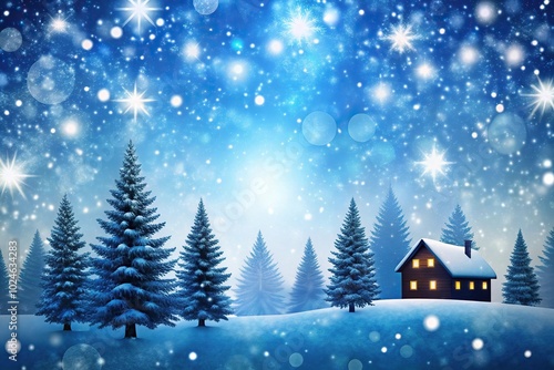 Snowy Christmas scene with silhouettes of trees and house