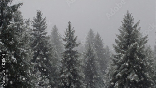 Snowy coniferous forest scene with falling flakes and diffused light
