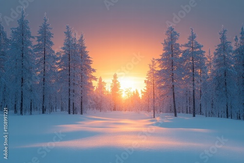 Snowy forest at sunset with trees covered in white frost and a warm glow on the horizon