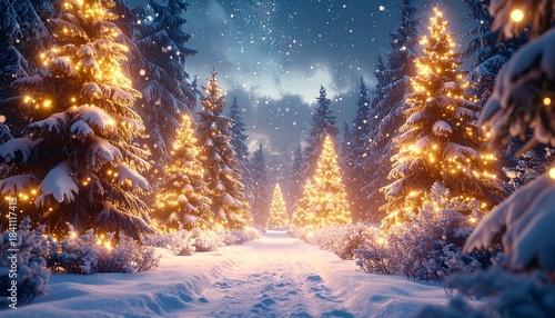 Snowy forest path lined with illuminated Christmas trees and falling snow