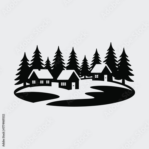 Snowy Forest Winter Village Silhouette Vector Black Minimal Flat Design White Background