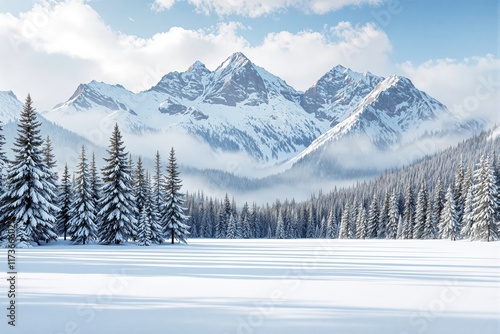 Snowy mountain landscape with evergreen trees on a bright winter day.