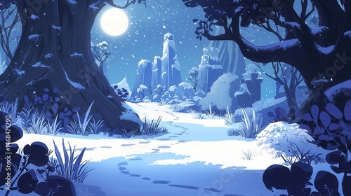Snowy Path Through Winter Forest to Mysterious Mountains Under Night Sky