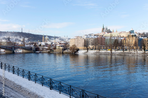 Snowy Prague Lesser Town with Prague Castle above River Vltava, Czech republic