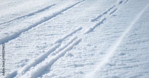 Snowy surface shows tracks. Parallel lines suggest movement across winter landscape. Bright sunlight illuminates pristine conditions.