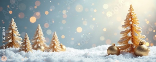 Snowy white background with golden Christmas decorations, including trees and ornaments, tree, twinkling