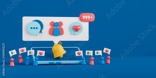 Social media or network concept. 3d render smartphone with social network notification banner and bell icon.