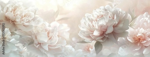 Soft and delicate white peonies blooming beautifully, creating an elegant and romantic atmosphere with a light, pastel background. Floral design concept.