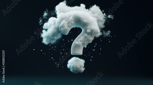 soft, cloud like 3D question mark gently glowing in dark background evokes curiosity and wonder. Its ethereal appearance invites contemplation and exploration