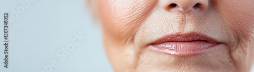 Soft golden light illuminates the delicate lines of an elderly woman's lips, enhancing their healthy pink tint. The organic beauty aesthetic embraces natural aging gracefully