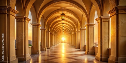 Soft golden light streams through intricate arches of a colonnade, illuminating the pathway to a distant doorway with warm ambiance and serene atmosphere , doorway, glow
