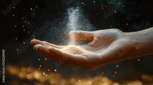 Soft Hand Holding Fine Sand with Glittering Particles in Background