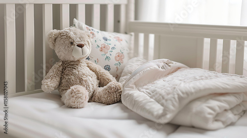 soft pastel bedding with plush teddy bear in cozy crib featuring delicate embroidery on the blanket adding a touch of charm to the nursery space