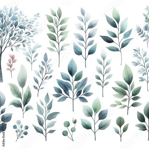 Soft Pastel Watercolor Foliage Collection Featuring Leaves and Branches – Versatile Natural Elements for Modern Graphic Design, Print, and Digital Artwork