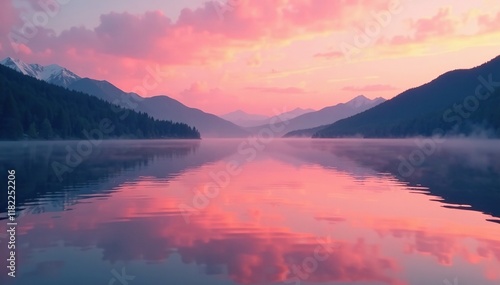Soft pink and orange tones softly reflected in the calm waters of a serene lake, lake ripples, serene lakes, sunset colors