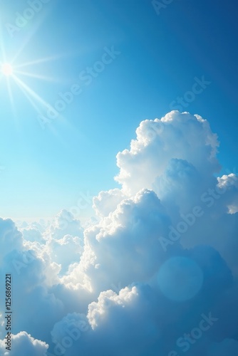Soft rays of sunlight illuminate fluffy white clouds in a vast blue sky, cloudy, serene, serene