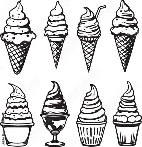 Soft serve ice cream set — black and white stylized swirls in cones, cups, and sundae dishes for dessert and food themes