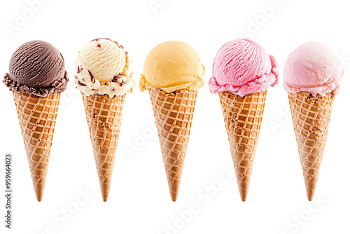 Soft vanilla ice cream scoop in a crispy wafer cone, isolated on white background