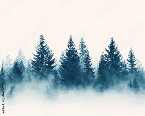 Soft watercolor effect of pine trees in mist, elegant and artistic tone
