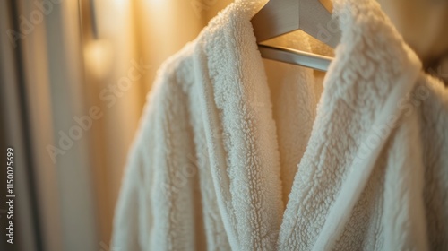 Soft white bathrobe hanging on wooden hanger in closet.