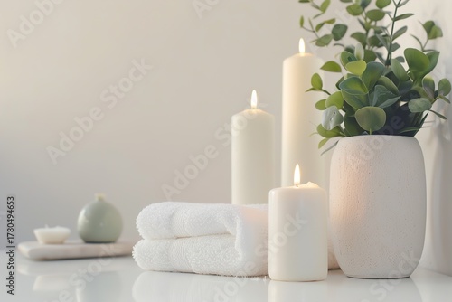 Softly glowing candles illuminate the peaceful space filled with green plants. Fresh towels are neatly arranged, inviting visitors to relax and unwind in a tranquil home spa environment