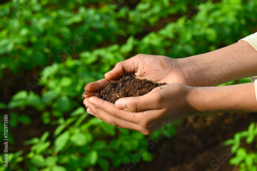 Soil in hand, palm, cultivated dirt, earth, ground, brown land background. Organic gardening, agriculture. Nature closeup. Environmental texture, pattern. Mud on field