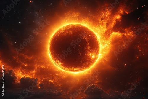 solar eclipse overlaid with a vibrant neon effect, featuring a blazing star edge behind the planet in a dark sky, highlighting the awe and mystery of cosmic phenomena