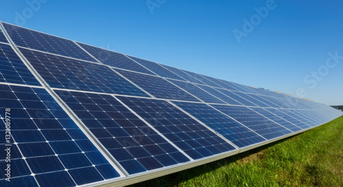 Solar panels installed in a green field under a clear blue sky