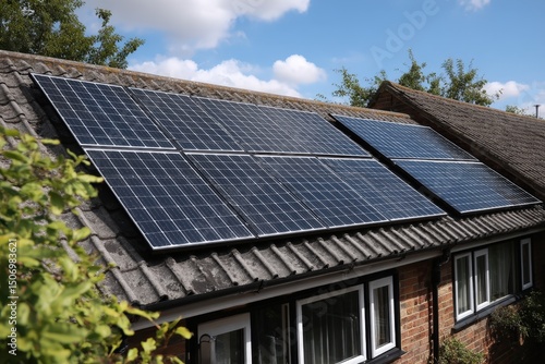 Solar panels installed on a house roof, generating renewable energy under a partly cloudy sky.