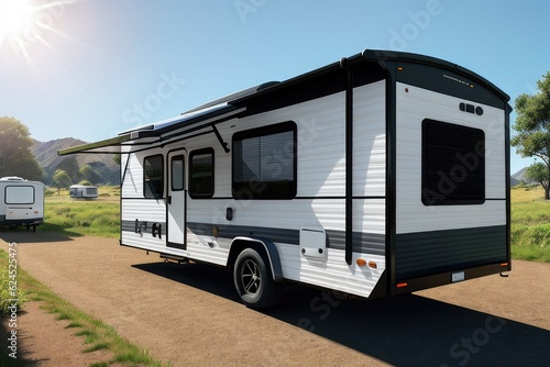 Solar panels on roof of a travel trailer. Eco-friendly mobile home. Green renewable energy. Camper van with solar panels on roof in summer mountains landscape. National tourist route. Generative AI.